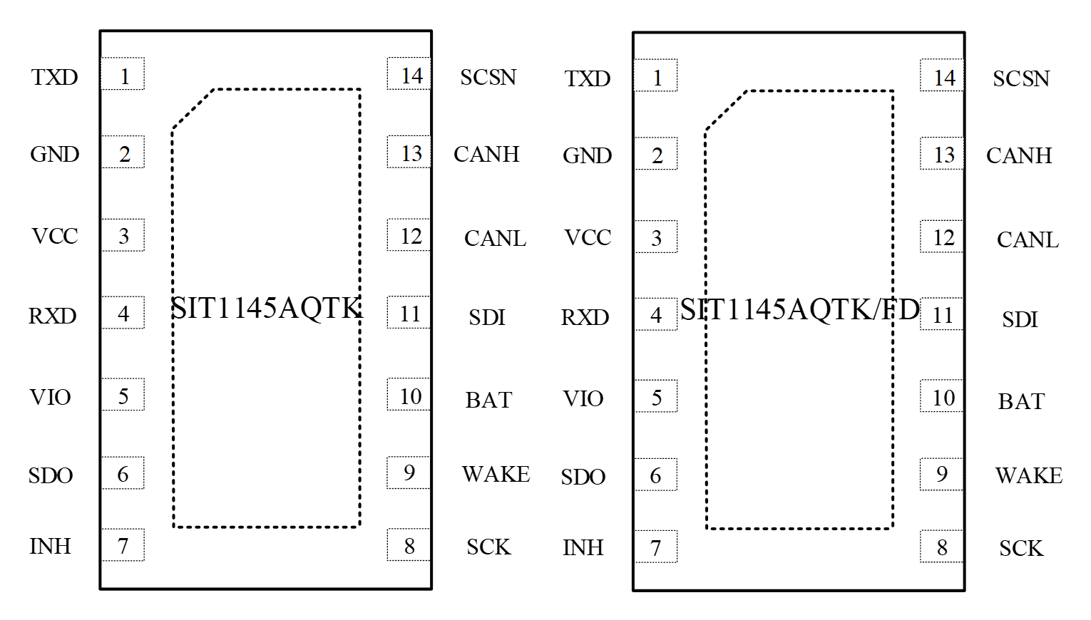 SIT1145AQ總線端口耐壓可達(dá)-58V至+58V,接收器共模輸入電壓達(dá)到-12V至+12V,VBAT工作電壓5.5V~40V, 耐壓可達(dá)70V, 適用于 12V 或 24V 應(yīng)用系統(tǒng)。