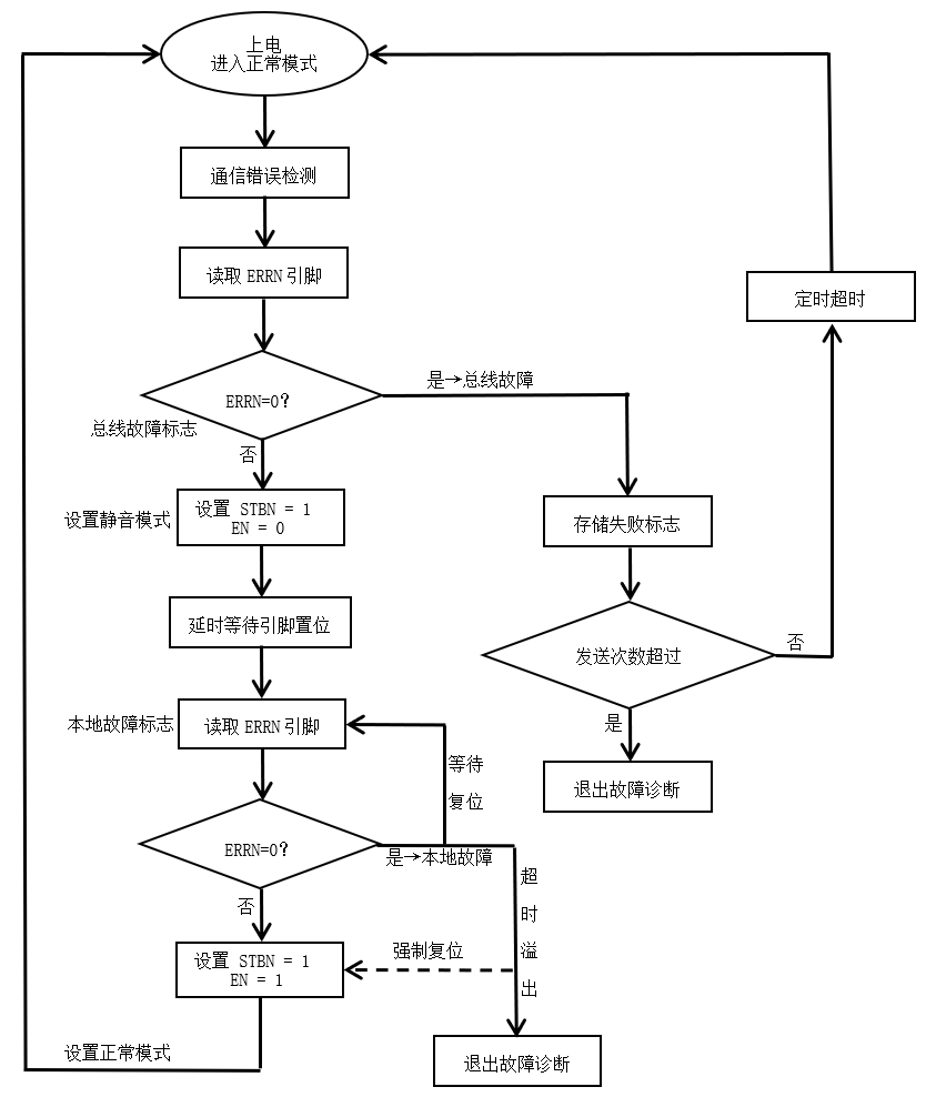 ECU節(jié)點上電啟動后SIT1043Q進入正常模式,在正常模式下MCU微控制器通過讀取引腳ERRN電平,來進行總線故障診斷。如果獲取到ERRN=0,則通信故障是由總線故障引起,MCU控制器置位總線故障通信失敗錯誤標(biāo)志。如果獲取到ERRN=1,則控制器復(fù)位總線故障通信失敗錯誤標(biāo)志。這時如果MCU控制器強制SIT1043Q進入到靜音模式,在靜音模式下,如果控制器獲取到ERRN=0,則可以診斷位本地故障。如果進一步獲取本地故障的哪一個類別(比如TXD顯性超時或總線顯性超時),可以由控制器操作RXD=0&TXD=1或者RXD=1進一步識別。