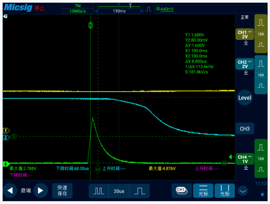 干擾幅值(綠色通道)由原來(lái)的2.8V降低為0.33V左右,此時(shí)INH(藍(lán)色通道)輸出高,各功能均能正常工作。