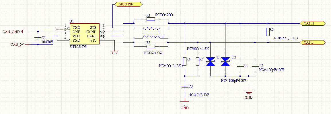 CANH 和 CANL 輸出到 GND 的一對匹配電容用于提高抗電磁干擾的性能。相應(yīng)噪聲源的阻抗和 CANH 和 CANL 對地的電容組成了一個 RC 低通濾波器。電容值必須由節(jié)點(diǎn)的數(shù)量和數(shù)據(jù)傳輸頻率決定。一般選取<100pF,如果外接 ESD 保護(hù)器件,該電容值可適當(dāng)減小或省掉。圖中串聯(lián)電阻可調(diào)整與對地電容形成的低通濾波器性能,但電阻值不應(yīng)過大,導(dǎo)致顯性差分電壓值降低明顯。